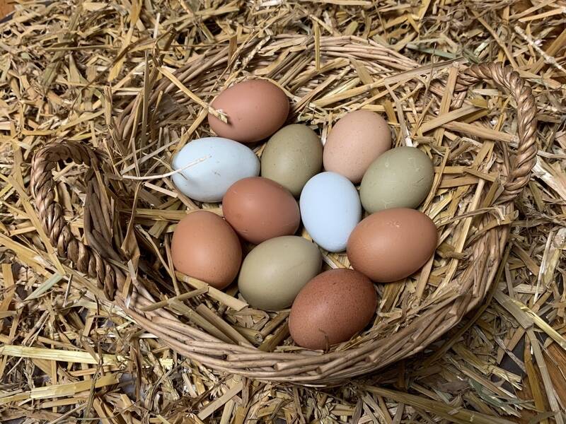 Jeden Morgen belohnen die Hühner unsere Arbeit mit dem Legen vieler verschiedener Eier ( weiß, braun und grün ).
